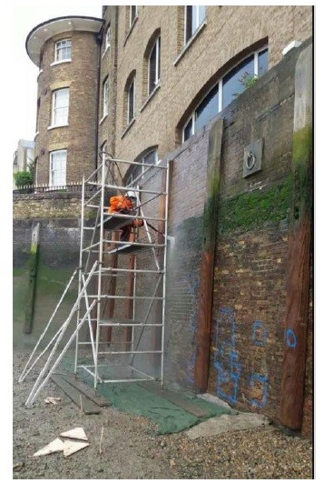 Devon House is located at St Katharine's Docks in central London, east of Tower Bridge at the north bank of River Thames. The river wall in front of the building is approximately 50m long and 5.5m tall. As part of the planned maintenance, the river wall has been inspected to identify the defects and the outline specifications have been prepared for the brickwork repairs. The works included structural and general repairs to the fabrics of the wall, to halt current wave action wash out and erosion that has occurred throughout the years. The following works have been carried out: